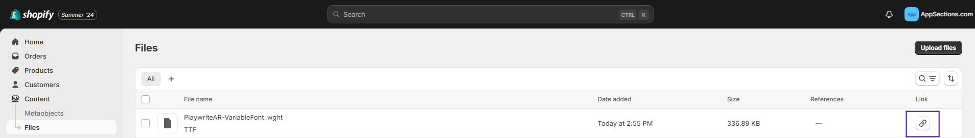 * Once the file is uploaded, click on the **Link** button next to the uploaded file to get the URL link for the font file.